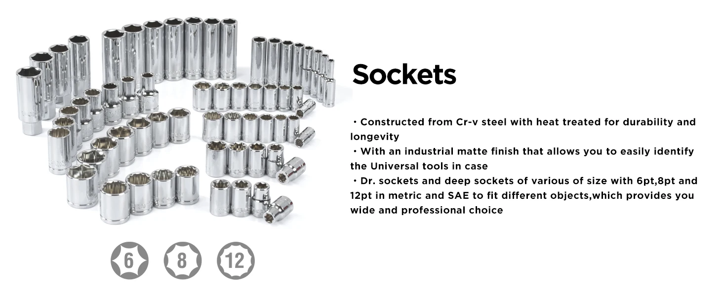 3PC 1/4"& 3/8"& 1/2" quick-release ratchet handle; 12PC Combination Wrench; 4PC Mini Combination Wrench;23PC 1/4" Dr. sockets in metric& SAE: 4、5、5.5、6、7、8、9、10、11、12、13、14mm; 5/32"、3/16"、7/32"、1/4"、9/32"、5/16"、11/32"、3/8"、7/16"、1/2"、9/16", 6pt; 10PC 1/4" Dr. SAE sockets: 3/16"、7/32"、1/4"、9/32"、5/16"、11/32"、3/8"、7/16"、1/2"、9/16",12pt