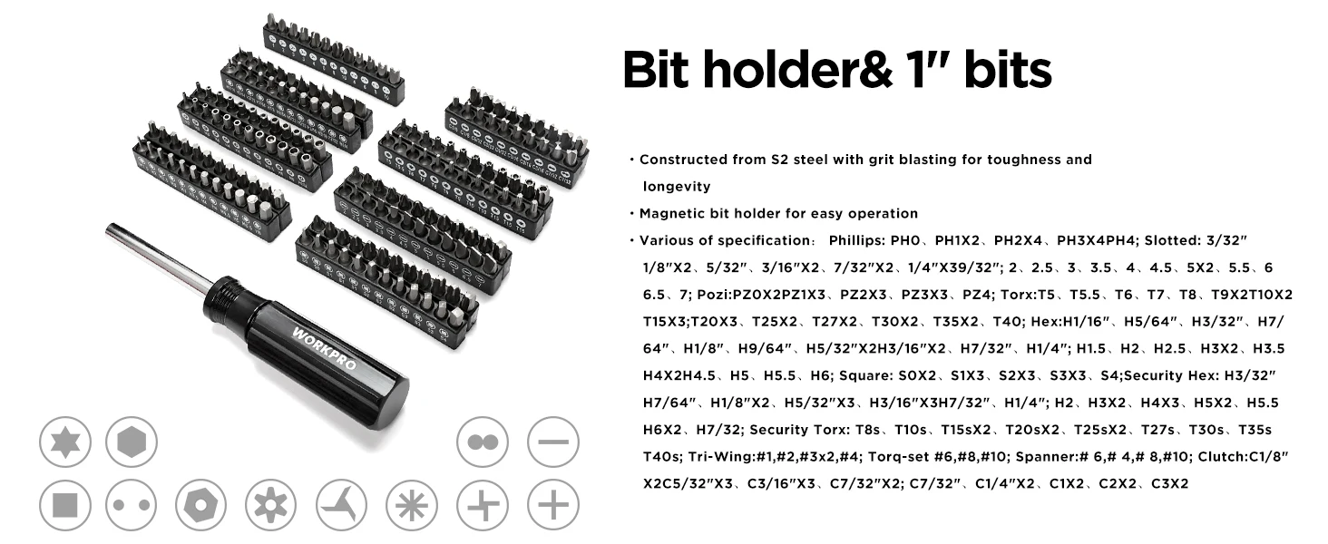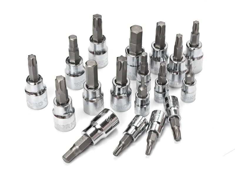 3/8" Dr. bit sockets: T27、T30、T40、T45X2、T47、T50; H5/32"、H3/16"、H1/4"、H1/4"、H5/16"、H3/8"、H4、H5