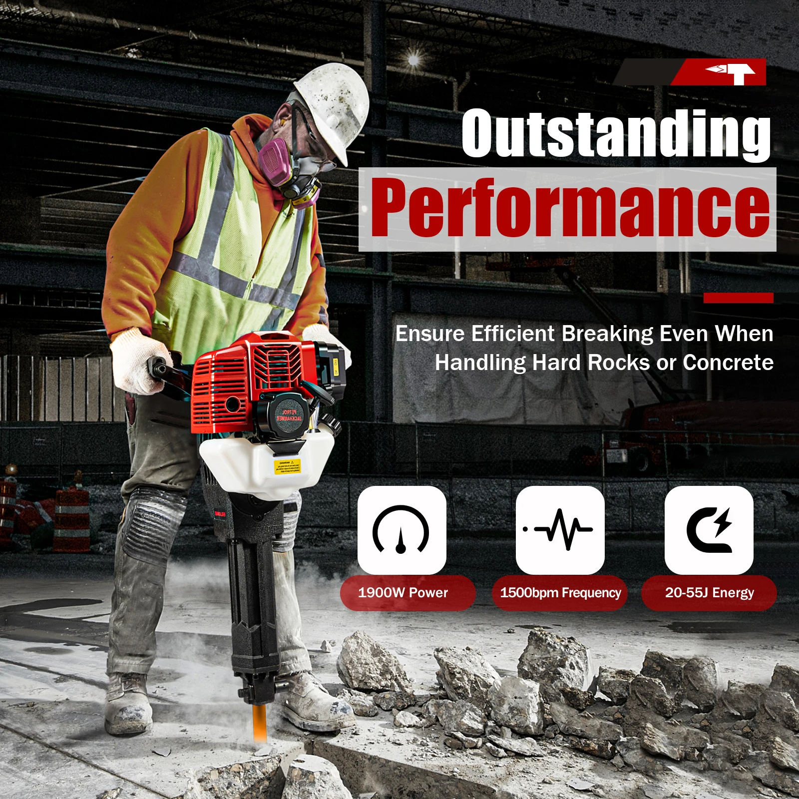 Outstanding Performance: Its 1900W engine with 1500bpm impact frequency and 20-55J impact energy provides stable and great power output, ensuring efficient breaking even when handling hard rocks or concrete.