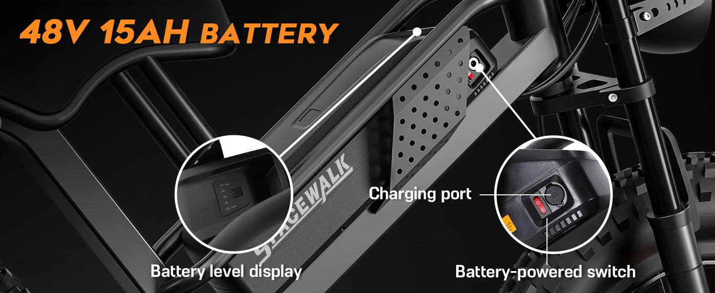 【Motor & Battery】 Features a 750W motor with 3-speed settings and a maximum speed of 24.9MPH.Equipped with a 48V 15AH removable battery,it offers a range of 37 miles in pure electric mode and 55 miles in electric assist mode.The battery can be easily removed using a key for convenient charging.