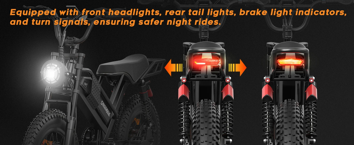 【Multi-Shock System】 Equipped with a total of 4 shock absorbers (2x front and 2x rear),along with a large shock-absorbing saddle design and 20" X 4" fat tires for enhanced cushioning,providing a more comfortable ride.All-terrain tires are suitable for mountain,sand,snow,grass,and various other surfaces.