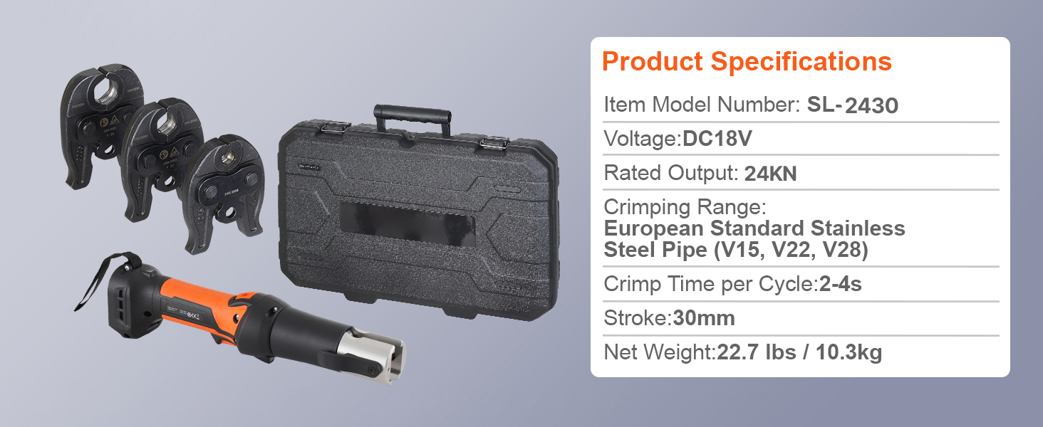 Wide Application Range: Automatic crimping with electric control, saving time and effort. The press tool automatically returns to the starting position after crimping, suitable for crimping stainless steel pipes. Ideal for residential and other industrial applications.