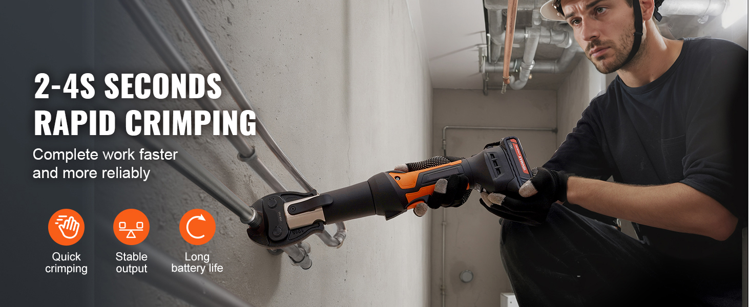 Convenient Operating Experience: This electric pipe crimping tool is compact in size, ideal for tight spaces and overhead tasks. Ergonomically designed handle for comfort; safety pin locks attachments in place to prevent unsafe conditions, providing greater operational flexibility and comfort for users.